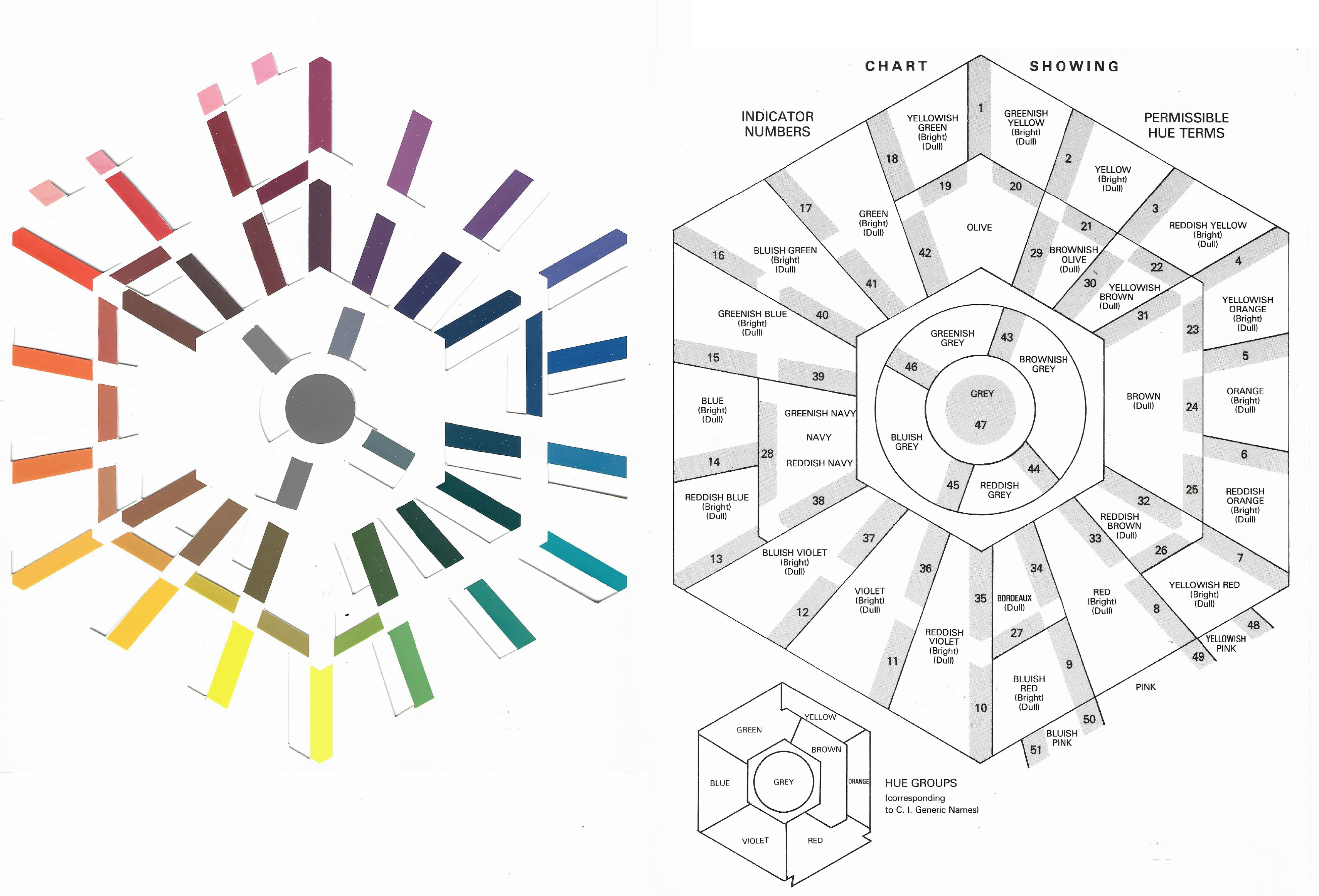 To overcome these inconsistencies and to introduce some measure of standardisation a hue indication chart, in the shape of a hexagon, gives prominence to the six major divisions of alternate primary and secondary hues, and at the same time provides continuity.